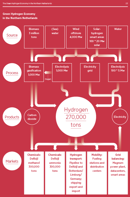 ING’s Economics Department analyzed the effect of decreases in gas production on the economy of the Northern Netherlands. Rabobank prepared an initial financial model to assess the viability of the construction and operation of electrolysis and biomass gasification for production of green hydrogen. Accenture has analyzed how the realization of a green hydrogen economy in the Northern Netherlands should be organized.
