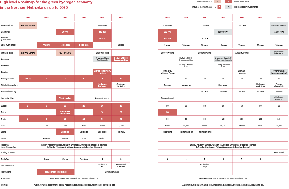 The roadmap calls for a new ammonia plant, using renewable hydrogen to produce green ammonia, to be built in two phases in Delfzijl. The first phase (150,000 tons per year) will be online by 2022 and is identified as a priority area for realization; the second phase (also 150,000 tons per year) is projected to be online by 2024, for a total estimated investment of 600 million EUR.