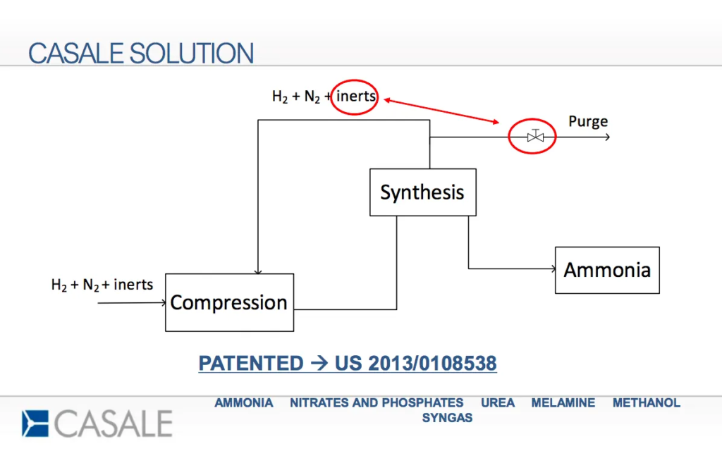 The key to Casale’s strategy for managing plant load variation, which it patented back in 2013, is its handling of the inerts. These unreactive gases in the synthesis loop are usually overlooked, in deference to the hydrogen-nitrogen mix, but they could be crucial to maintaining plant operating conditions at times when renewable-powered electrolytic hydrogen production is curtailed.