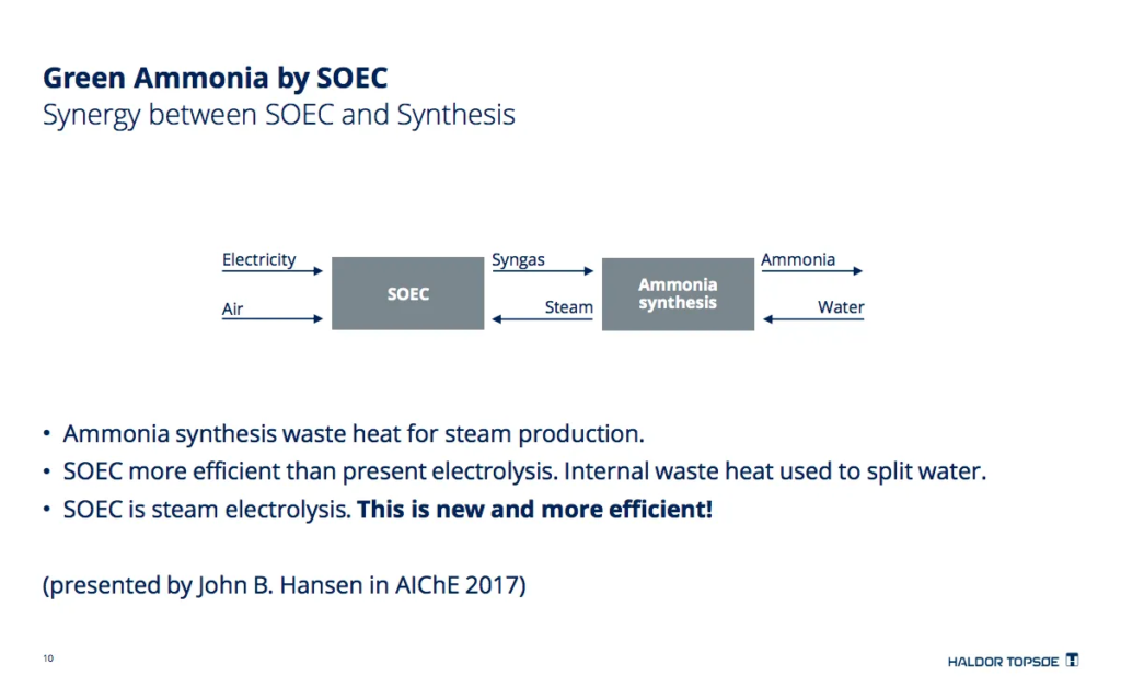 This highly integrated process was introduced at last year’s NH3 Fuel Conference, and is based on a solid oxide electrolysis cell which has been under development for decades.