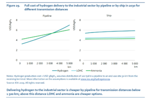 . . . despite the many uncertainties around most of these cost components, IEA analysis suggests that for inland transmission and distribution, hydrogen gas is the cheaper option for distances below around 3 500 km. Above this distance, ammonia pipelines would be the cheaper option. Comparing transport using pipelines and ships, transmission and distribution of hydrogen gas by pipeline is cheaper for distances below around 1 500 km. Above this distance, LOHC and ammonia transport by ship, which are broadly similar in terms of their full costs, become the cheaper delivery options.