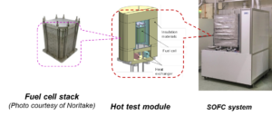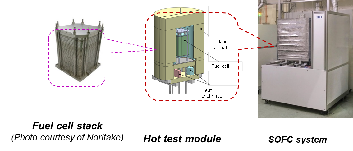 In the course of this research and development, a research team at Kyoto University confirmed that NH3 could be used as a fuel for SOFCs and that the power generation performance of NH3-fueled SOFCs was equivalent to that of pure hydrogen (53% efficiency (LHV) at 255W of direct current power generation) [9]. Based on these results, Noritake Company, Ltd. fabricated a 1kW-class stack, and IHI Corporation developed a 1kW NH3-fueled SOFC system [10]. IHI Corporation is continuing development of a larger commercial-use NH3-fueled SOFC system.