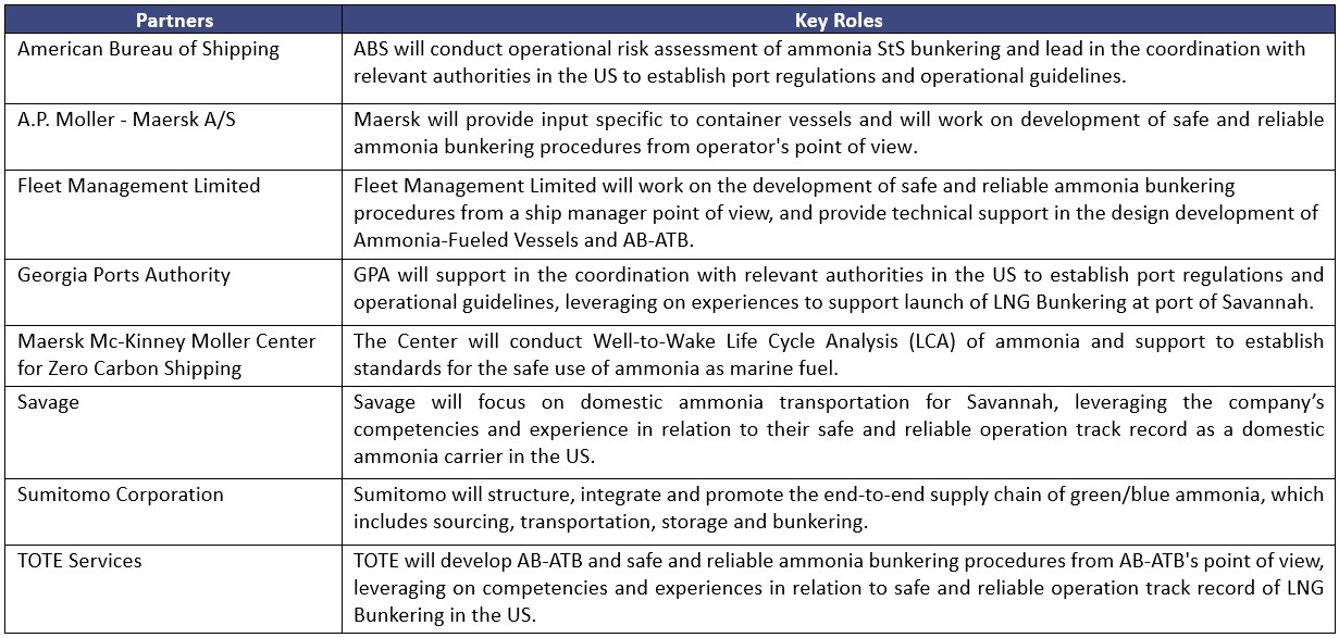 The consortium aims to establish a comprehensive supply chain to allow ship-to-ship ammonia bunkering in Savannah. As well as confirming what extra infrastructure will be required, the study scope includes design of an Ammonia Bunkering Articulated Tug-Barge (AB-ATB) vessel. On the safety side, study findings will be used to formulate standards and operating procedures for the use of ammonia as a maritime fuel. For this task the consortium will leverage its own expertise, as well as engaging relevant government agencies and US-based experts.