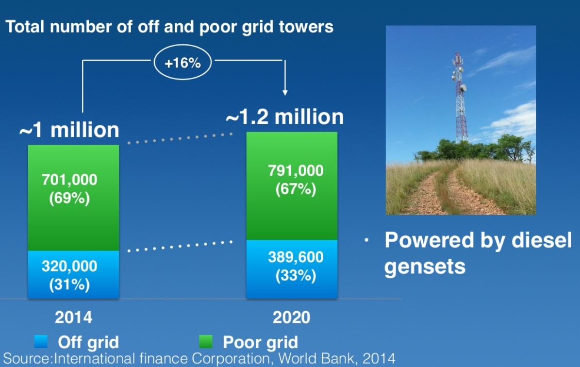 RenCat’s initial target market is stationary power in developing countries, where the electric grid either doesn’t exist or isn’t reliable – specifically, the fast-growth market for supplying power to remote cell phone towers across Africa and Asia. Grameen Phone currently operates roughly 11,000 cell phone towers across Bangladesh, serving 60 million customers.