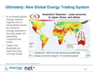 Accordingly, Szymanski started his talk with facts and figures on today’s ammonia industry. Halfway through, though, he pointed to the University of Minnesota’s wind-to-ammonia Zero-Emission Ammonia Pilot Plant as a trailblazer for small-scale, distributed ammonia production that can serve local fertilizer markets. On his next slide, he showed how green ammonia could progress from that starting point to major energy applications such as grid-scale energy storage and fuel-cell-powered vehicles. On a third slide he included a screenshot of a graphic that had been shown at the 2016 NH3 Fuel Conference by Keith Lovegrove, Head of Solar Thermal at IT Power Group in Australia. The graphic depicted ammonia as an energy carrier that can transport renewable energy captured in Australia to end uses in Japan’s hydrogen energy economy. The headline of the slide made reference to the potential for a “new global energy trading system.”