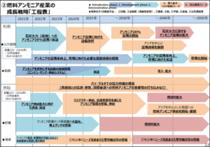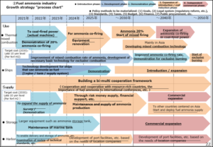 On the supply side, the Overview states that “one coal-fired unit with 20% co-firing requires 500,000 tonnes of ammonia annually. If implemented on all domestic coal-fired power plants, 20 million tonnes of ammonia would be required annually.” Pursuant to the theme of international collaboration, the strategy envisions the cooperative development of a supply chain that links “ammonia-producing countries (North America, Australia, Middle East) with consuming countries (Asia including Japan).” By 2050, the total volume of ammonia trade related to electricity generation would reach 100 million tonnes.