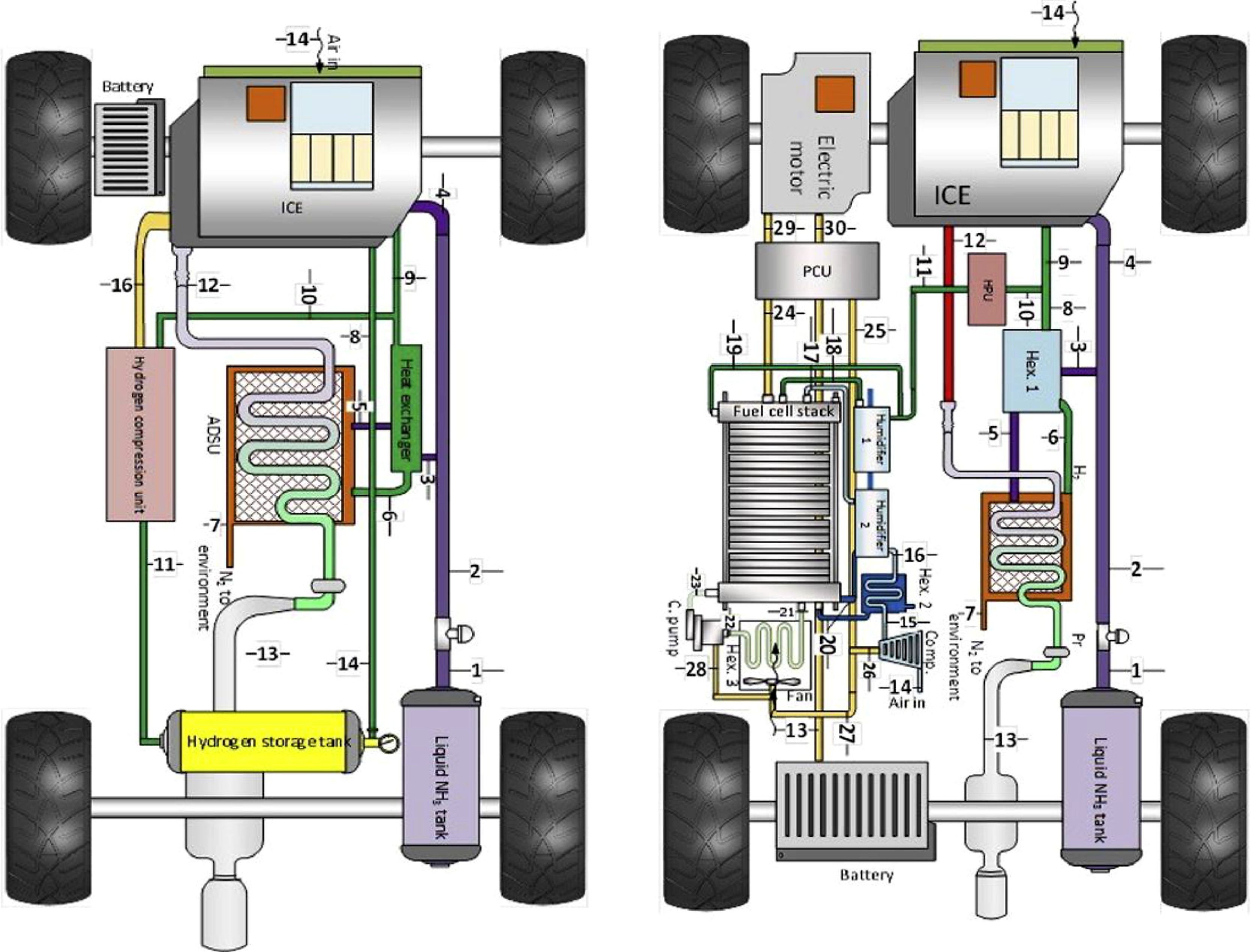 Recent studies [208] evaluate the implementation of hybrid systems. Developments show two systems using ammonia-hydrogen fuel for either an internal combustion engine or a combination of an ICE with PEM fuel cells to power a vehicle, Fig. 23. The study was performed with and without dissociation of ammonia. The results from the theoretical study show that the amount of exergy that is recovered using ammonia dissociation (i.e. hydrogen) are considerable, i.e. 16.4% and 13.1% for the ICE and the ICE-PEM systems respectively, consequence of the added hydrogen coming from the dissociation unit. Thus, the use of hydrogen from cracked ammonia is highly beneficial when compared to pure ammonia injection. It must be emphasized that integration of heat recovery for dissociation units played an important role in improving these systems, concept that can be expanded to other combustion technologies to increase efficiency while minimizing exergy destruction.