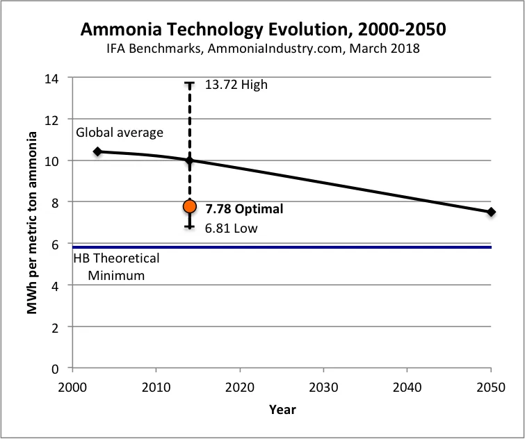 The dashed vertical line illustrates the high-low range of plant efficiencies captured in the 2014 average. While the data are anonymous, the high figure most likely represents an old coal-fed plant, while the low figure is, in fact, too low! It perhaps represents a plant that bypasses normal measurements of efficiency by using, for example, byproduct hydrogen without the need for any fossil fuel reformation. The “Optimal” figure of 7.78 MWh (28-29 GJ) per ton describes a new natural gas-fed world-scale ammonia plant built today using best available technology (BAT).