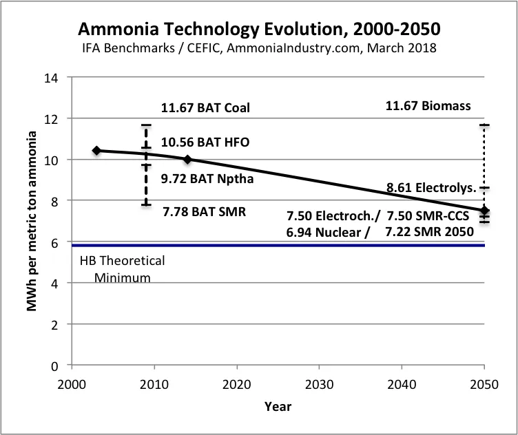 The “Global average” data is from the IFA’s ongoing bench marking project, which collects efficiency metrics from active ammonia plants worldwide. Between the first benchmark (2003) and the latest one (2014), the energy consumption of the global fleet of ammonia plants dropped from 10.42 MWh to 10.00 MWh (37.5 GJ to 36 GJ) per ton ammonia. Impressive as this is, it illustrates how the future evolution of Haber-Bosch will deliver diminishing returns on investment and invention.