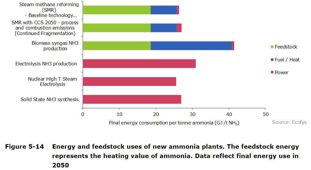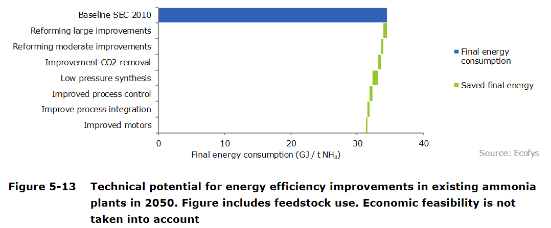 The first chart identifies the future energy savings possible from improvements on existing ammonia synthesis technology. It stresses the point that, while these improvements on natural gas-fed Haber-Bosch are technically possible, “economic feasibility is not taken into account.”