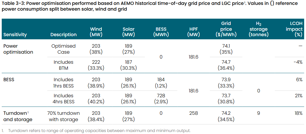 Click to enlarge. Electricity sourcing scenarios for the renewable hydrogen plant. Table 3 from Parmelia Green Hydrogen Project: Feasibility Study Summary Report (APA Group & WesCEF, Oct 2024).