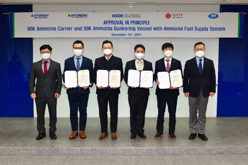 Importantly, the new AiPs mark the first milestone achievement for the ‘Green Ammonia Shipping/Bunkering Consortium’, which was launched in May 2021 with the explicit purpose of developing ammonia-fueled ship designs for approval by Korean Register. The six member consortium (KSOE and HHI are joined by Lotte Fine Chemical, Lotte Global Logistics, Hyundai Merchant Marine and POSCO) was featured in our Australia conference last year.