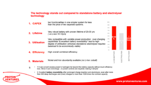 The battolyser has additional economic attractions. The nickel-iron battery’s proven lifetime of 20-30 years improves significantly over the Li-ion battery (10-12 years). Combining two functions in one device reduces system complexity for the operator and, because the battery is designed to overcharge, power controls are not required. The components are plentiful and cheap, with none of the resource availability issues that impact lithium or copper markets. The battolyser has “excellent battery reversibility,” allowing for a high degree of utilization.
