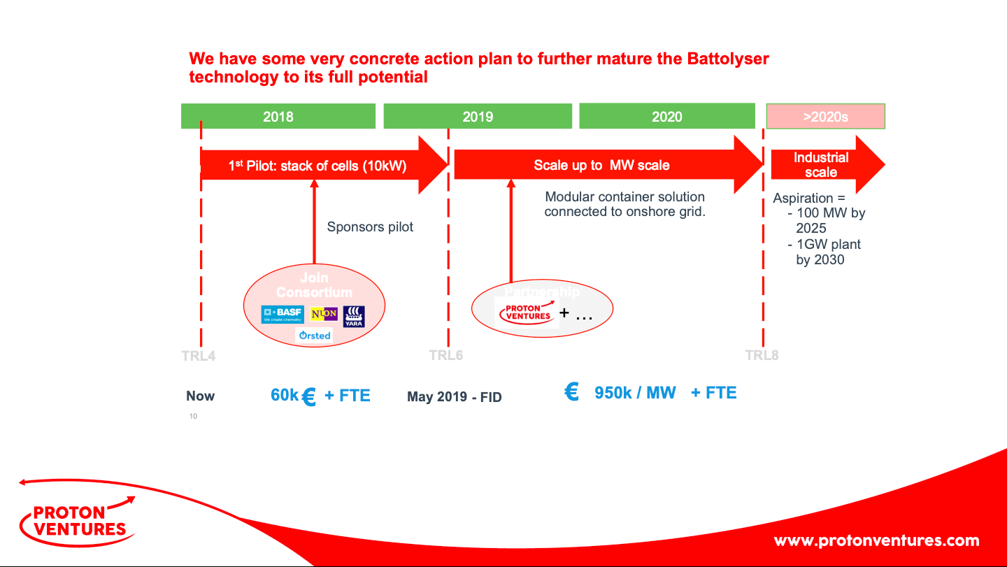 At the NH3 Energy+ Topical Conference last month, Hans Vrijenhoef of Proton Ventures gave the opening presentation, co-authored by Fokko Mulder of TU Delft, in which he described the battolyser’s robust combination battery and electrolyzer. He also mapped out Battolyser BV’s technology development and investment pathway, beginning with the kW-scale pilot plant that is already underway and expected to be operational by Spring 2019, and a MW-scale, modular, containerized plant which should be complete by the end of 2020. Reaching a technology readiness level of TRL8, Battolyser BV then aims to increase industrial scale swiftly, demonstrating a 100 MW unit by 2025 and a 1 GW battolyser by 2030.