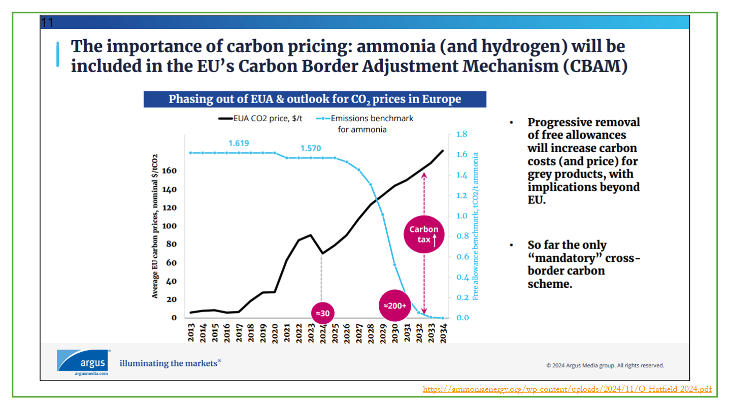 The Beaumont Clean Ammonia Project initially targets the European market. A key reason for this is the existing ETS (Emission Trading System), with phase out of Free Allowances and CBAM (Carbon Border Adjustment Mechanism). The Free Allowances provided the European industry to emit up to a given threshold, before buying CO2 emission rights. The current emission benchmark for the ammonia industry is about 1.6 ton CO2 per ton ammonia, but these Free Allowances will be phased out toward 2034. CBAM implies that CO2 emissions imported to the EU will be taxed at market ETS prices, which were in the range €60-100 per ton CO2 in 2023 and 2024. Woodside estimates a carbon footprint for its lower-carbon product of 0.8 tons CO2 per ton ammonia: well within current and future EU benchmarks.