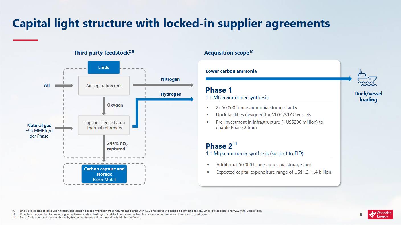 Interestingly, the primary component in LNG (methane) is also the feedstock for gas-based ammonia production. By producing low-emission ammonia from gas reformation with CCS (carbon capture & storage), CO2 is mitigated at production location, rather than exporting LNG energy and attempting CO2 mitigation at the import location. This makes ammonia a low-emission liquid gas commodity, complementing Woodside Energy’s current LNG and future liquid hydrogen export projects. Woodside Energy approaches the liquid gas commodity market via a portfolio approach with multiple supply locations, such that supply can be guaranteed. Woodside Energy will use a similar approach for its emerging low-emission ammonia business.