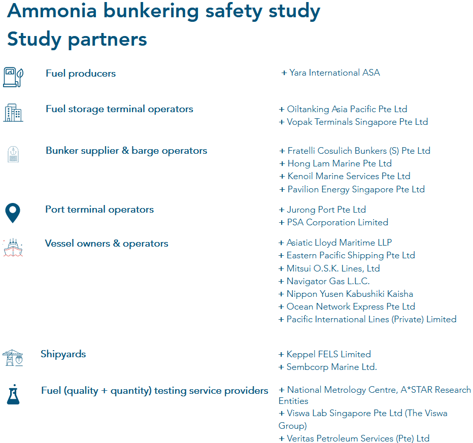 …the intent of this study is to define a robust set of safety guidelines and operational envelopes that will establish the basis of a regulatory sandbox for trials at two local bunkering sites. Handling ammonia as a bunker fuel will require more stringent safety and operational guidelines compared to transporting ammonia as a commodity given the substantively higher transfer frequency and the need for more flexible transfer configurations. This study will build on guidelines that have been developed for safe handling of ammonia as a commodity by defining and then integrating or overlaying the guidelines required for safe handling ammonia as a bunker fuel.