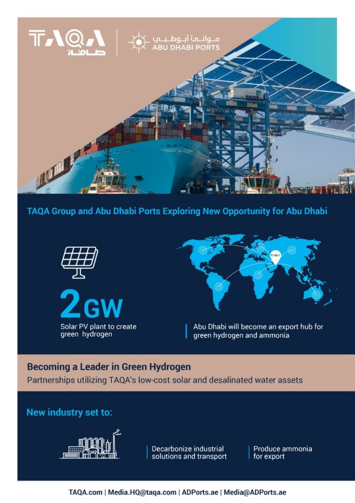 TAQA Group and Abu Dhabi Ports are planning a green ammonia export facility to be based in the Khalifa Industrial Zone Abu Dhabi (KIZAD). A 2 GW solar power plant will power electrolyzers that will feed green hydrogen into the ammonia production facility, with a pipeline to connect the setup to storage tanks at nearby Khalifa Port.