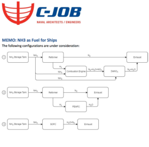 C-Job is evaluating three configurations for ammonia-fueled propulsion systems. The first and most easily adopted, because of the simplicity of conversion and low cost of deployment, uses “a dedicated combustion engine.” To overcome the difficulty of burning pure ammonia, part of the fuel stream is “cracked” in an on-board reformer, to provide a small amount of hydrogen fuel, which burns easily and thus acts as a combustion promoter, allowing the ammonia to combust more easily.