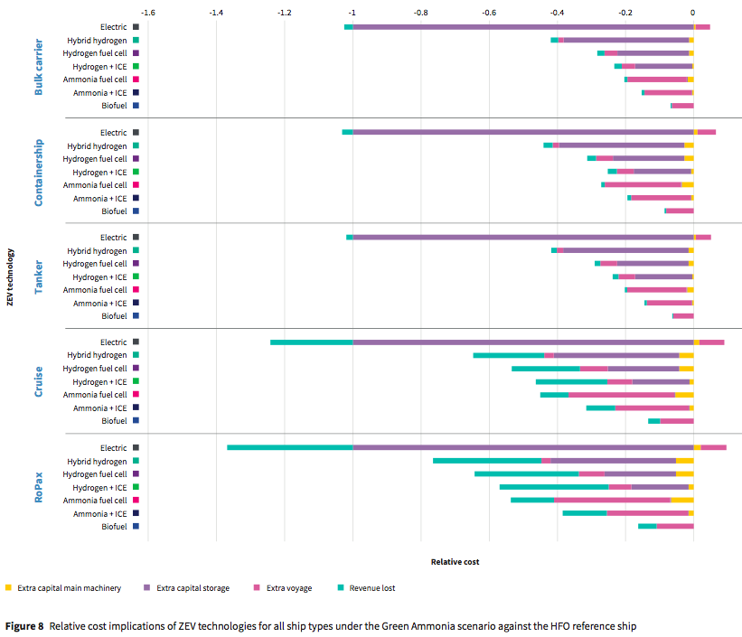 One of the essential considerations of this study, which is an “economic analysis, estimating the cash flow” of a range of merchant vessels using each zero-emission technology, is the lost revenue, due to the displacement of cargo by additional fuel storage tanks. Because hydrogen is significantly less energy-dense than ammonia, “it is the latter, in combination with the ICE, that appears the most competitive. This is because of the lower capital costs associated with the onboard storage of ammonia, relative to hydrogen.”