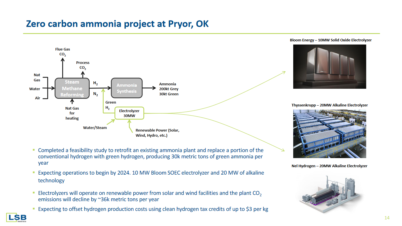 At Pryor, LSB Industries aims to decarbonize part of its current production using 30 MW of grid-connected electrolysis (20 MW alkaline electrolysis and 10 MW solid oxide electrolysis). This produce 30,000 ammonia per annum, equivalent to 13% of Pryor’s total production. The project is estimated to decrease CO2 emissions by 36,000 each year, and is likely to be eligible for the $3 per kilogram hydrogen production tax credit under the Inflation Reduction Act (IRA). The solid oxide electrolyzer will be delivered in 2024, and initially be operated by Bloom Energy.