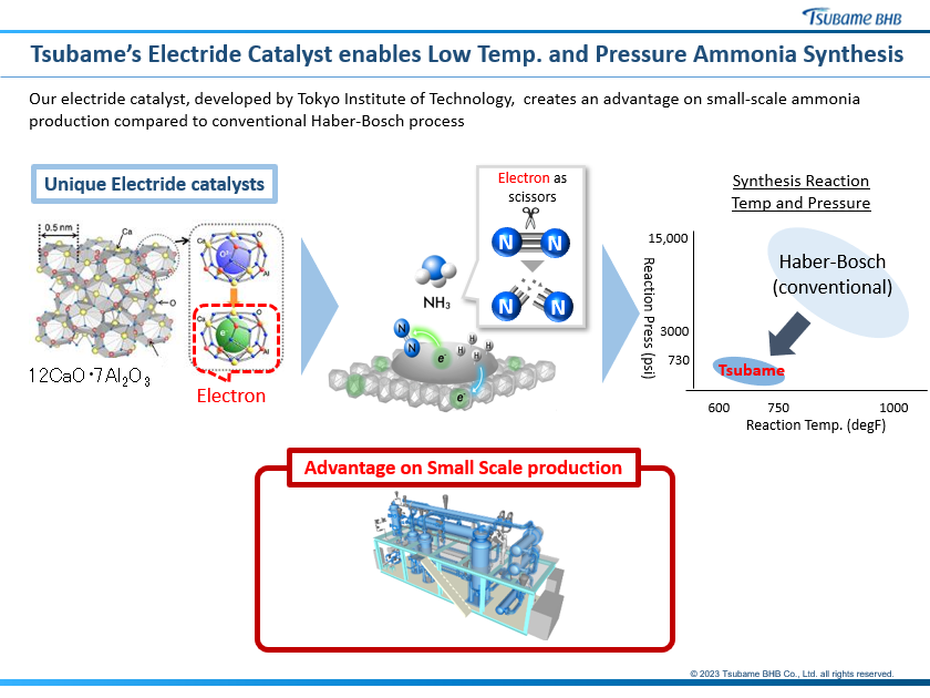 Tsubame is commercializing its low temperature and low pressure ammonia synthesis technology, based on the electride-supported catalyst. Since 2017, The milder operation conditions imply lower cost materials can be used for the reactor, heat exchangers, compressors, with the thickness of pipes and vessels also reduced.