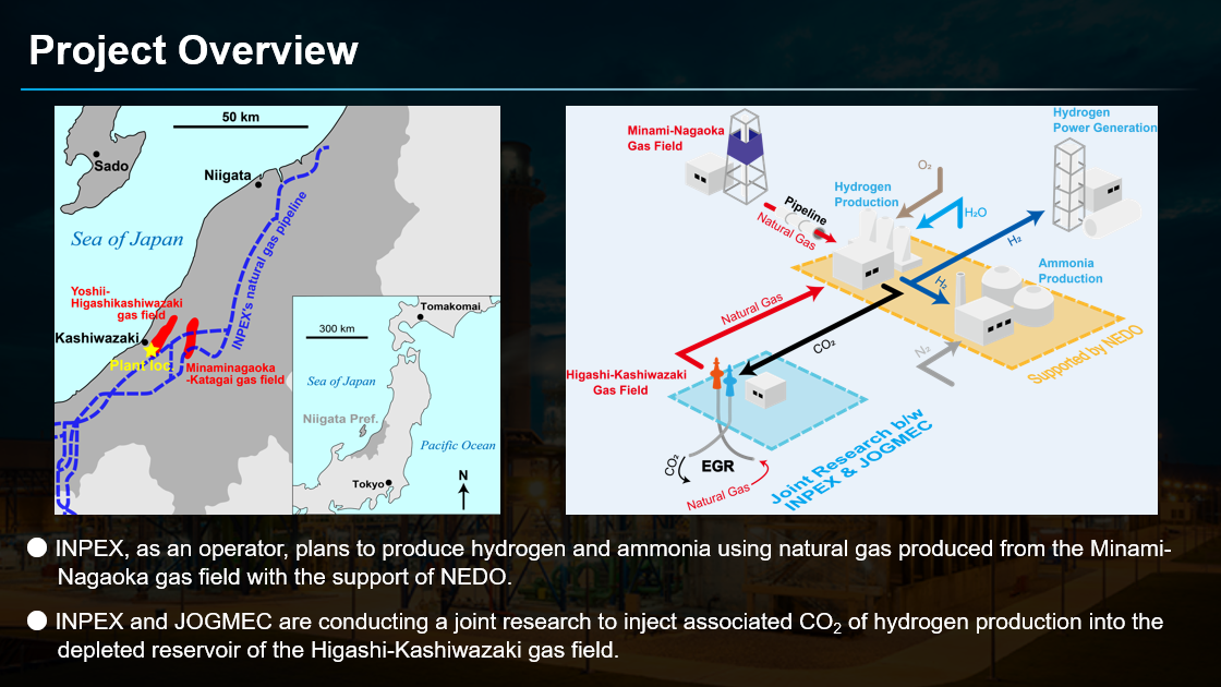 JOGMEC (Japan Organization for Metals and Energy Security) will perform joint research on EGR (Enhanced Gas Recovery) with INPEX. The goal of the project is to acquire knowledge and understanding on EGR. The Minami-Nagaoka gas field operated by INPEX will be used for natural gas extraction, which is subsequently transported by pipeline to the hydrogen and ammonia production plants. The CO2 produced during hydrogen production is then transported to the depleted gas reservoir of the nearby Higashi-Kashiwazaki gas field (abandoned since 2014), in order to extract additional natural gas from the reservoir while storing CO2 at the same time. Thus, EGR can be considered a combination of carbon capture and utilization (CCU) and carbon capture and storage (CCS), e.g. CCUS.