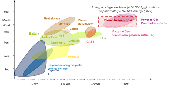 The argument for using ammonia for energy storage is not to compete with batteries, which excel in short-term, small-scale storage markets, but to address long-term and large-scale energy storage markets by providing a carbon-free alternative to conventional chemical energy stores: fossil fuels.