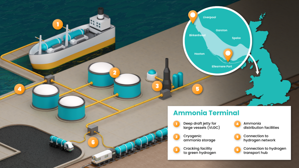 As part of the announcement, EET and Stanlow Terminals will develop an ammonia import terminal at the Stanlow complex. Existing ammonia storage facilities will be expanded, and the new terminal will include a deep-water jetty designed for VLGC vessels, an ammonia cracking facility, connections to a hydrogen vehicle refueling hub. The new terminal will be able to handle imports & storage of more than one million tonnes of ammonia per year from an under-development, 1 GW ammonia production project in Gujarat, India. Operations are scheduled to begin in 2027, with feasibility work underway.
