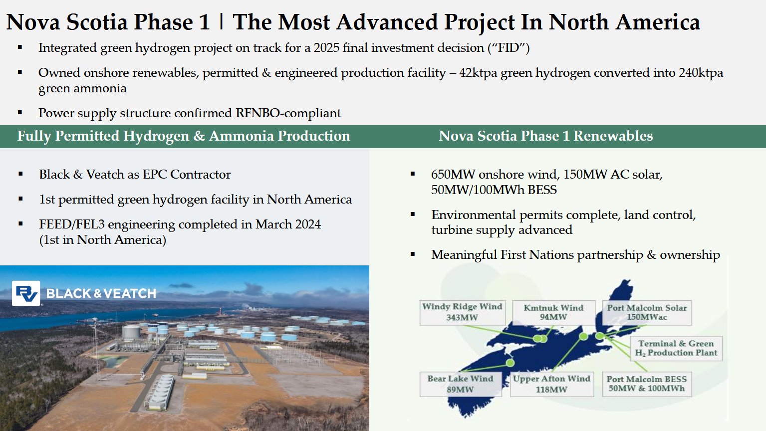 The first phase of the Point Tupper project features 240,000 tons per year of ammonia production, aiming for first operations in 2026. The project is connected to the grid, with 800 MW of new renewable development for electricity supply, including 650 MW of wind, 150 MW of solar PV, and 50 MW/100 MWh of battery energy storage systems (BESS). Environmental approval is already in place for various wind farms and for the renewable ammonia production facility itself, while also the FEED work has been completed. The projects are developed in cooperation with First Nations communities.
