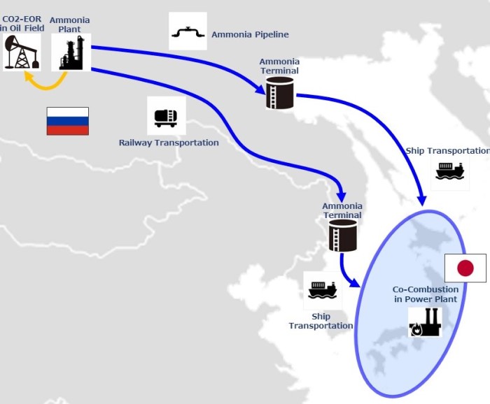 The new joint agreement was actually JOGMEC’s second blue ammonia announcement this week. An agreement between JOGMEC, Itochu and Irkutsk Oil Company will see those partners explore the feasibility of a blue ammonia value chain between eastern Siberia and Japan. Commercialisation of the conceptual value chain (pictured) would involve inland transport of blue ammonia from Siberia to Russia’s east coast by pipeline and railway. After ship transportation the blue ammonia reaches its final end-use: coal co-combustion.