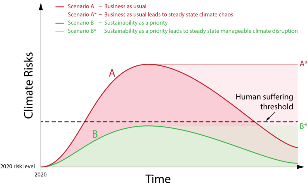 “Flattening the curve” through social distancing has been the mantra of the COVID-19 response, a reference to the necessity to slow down the growth of the number of infected individuals. The goal of this campaign is to prevent an overburdening of the healthcare systems that in turn mitigates the risk of additional suffering and fatalities. The same is true for climate change risk mitigation on an even broader scale since there will be a threshold beyond which humans will not be able to endure suffering when it comes to the impact on health & livelihood. Not exceeding this threshold limit means slowing down the growth rate of climate change risks today.