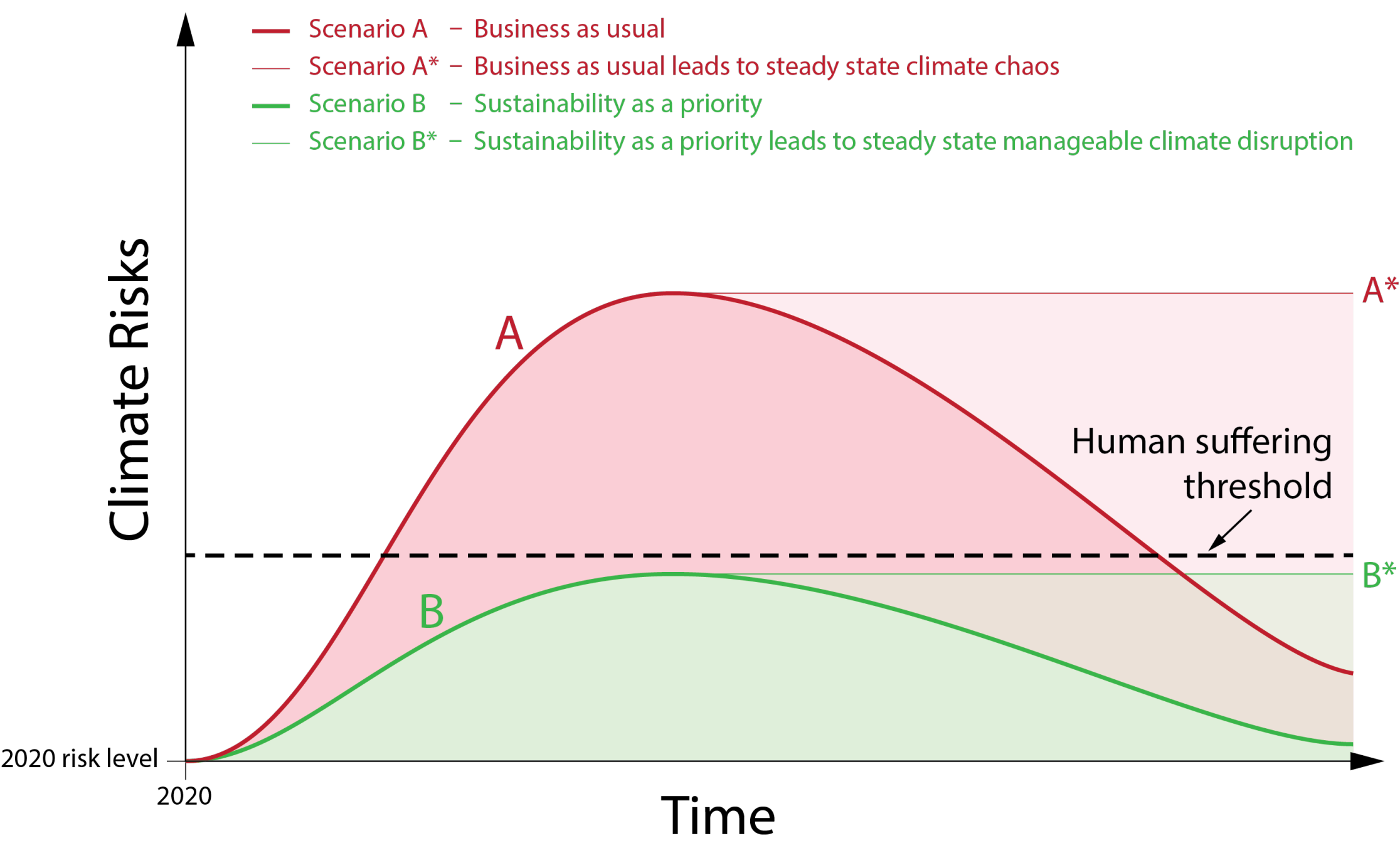 “Flattening the curve” through social distancing has been the mantra of the COVID-19 response, a reference to the necessity to slow down the growth of the number of infected individuals. The goal of this campaign is to prevent an overburdening of the healthcare systems that in turn mitigates the risk of additional suffering and fatalities. The same is true for climate change risk mitigation on an even broader scale since there will be a threshold beyond which humans will not be able to endure suffering when it comes to the impact on health & livelihood. Not exceeding this threshold limit means slowing down the growth rate of climate change risks today.