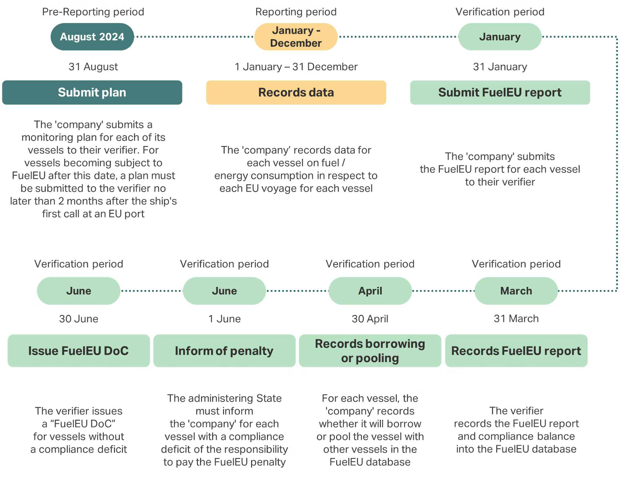 Click to expand. The compliance timeline for FuelEU, with implementation to begin at the end of this month. Source: Mærsk Mc-Kinney Møller Center for Zero Carbon Shipping.