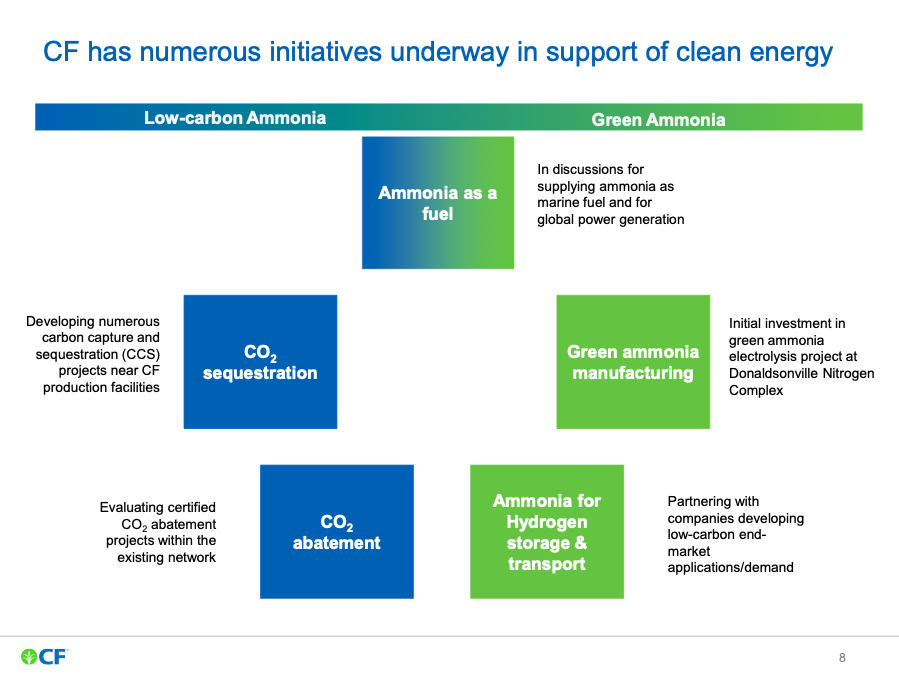 In order to execute these initiatives, CF is collaborating with leading technology companies, and has signed Memorandums of Understanding with ThyssenKrupp and Haldor Topsoe. The Company is also in discussions with global utilities and maritime transportation providers that have announced their intention to use low-carbon ammonia directly as a fuel.