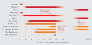 The methodology includes discrete cost calculations for initial collection of energy; conversion of energy to storable form; storage itself; and conversion back to electricity. Cost information was collected from “real projects” via “published sources and stakeholder consultations.” The lead author’s email announcement of the study’s release provides further description: “The study has developed an innovative subsystem based approach to modelling installed cost as a function of configuration and system size for each technology combination. This has been used to examine the LCOE of optimised systems under real input conditions as a function of duration of storage or operation.”