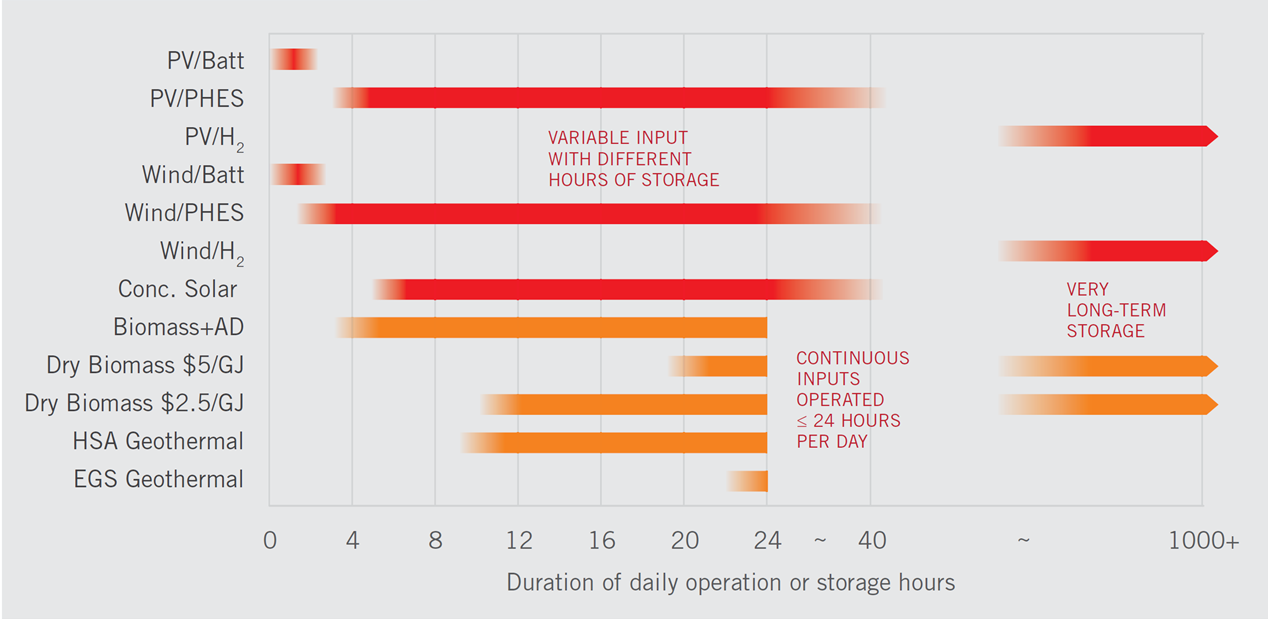 At AUD$106/MWh, the system that has the lowest LCOE to meet a one-hour firming commitment of renewable electricity is wind generation with battery-based energy storage. To meet a six-hour commitment, the two lowest LCOEs are provided by biomass processed with anaerobic digestion, at AUD$107/MWh; and “grid variable renewable electricity” (i.e., electricity generated at various locations from a mix of renewable sources and delivered over the electric grid to the point of storage) paired with pumped hydro, at AUD$113/MWh. At AUD$83/MWh, the biomass-AD option has the lowest LCOE to meet a 12-hour commitment. And geothermal has the lowest LCOE to meet a 24-hour commitment, at AUD$60/MWh. For time scales between 24 and 40 hours, the LCOE prize goes to systems that integrate either wind or PV with pumped hydro, and concentrating solar thermal systems, all in the range of AUD$120/MWh to AUD$140/MWh. (Baseload geothermal that runs continuously — i.e., beyond 24 consecutive hours — rather than as a dispatchable complement to other generating technologies, is excluded from the analysis. Regardless of other considerations, geothermal is a resource whose contribution is ultimately limited by the distribution of economically exploitable geological formations.)