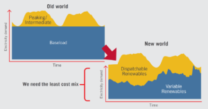 One of the report’s strengths is its presentation of the evolutionary processes currently at work within our electricity system. (Readers who are already well versed in the basics of the transition can skip to the next section.) A foundational driver of change is the displacement of fossil fuels by renewables. An unyielding grid imperative is that electricity demand must be matched at every second with supply, no matter how quickly or substantially demand goes up or down. Demand variability is characterized by patterns on three distinct time scales: second-by-second as electricity consumers turn electrical devices on and off; hour-by-hour as the level of activity ramps up and down over the course of a day; and day-by-day as seasonal changes call for more or less heat and light in the built environment. Fossil generation, with its reliance on large-scale plants, is not especially adept at responding to variations in demand, but over time utilities and grid management organizations have developed methods for meeting them.