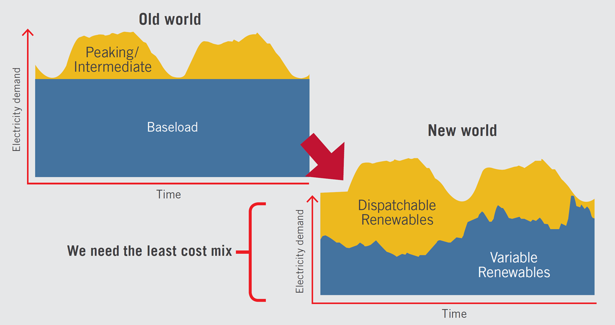 One of the report’s high-level findings is that “for each timescale different technologies are seen to offer the lowest cost energy.” (As a point of comparison for the figures below, a 2015 report sponsored by ARENA put the LCOE of dispatchable fossil generation technologies in Australia in a range from AUD$60/MWh to AUD$140/MWh, while variable renewable wind and solar PV have LCOEs of AUD$60/MWh and AUD$70/MWh respectively.)