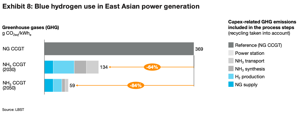 With blue hydrogen exported and combusted as ammonia for electric power generation, we could deliver an 84% reduction in emissions (59 gCO2eq/KWhe, compared to 369 gCO2eq/KWhe using natural gas today).