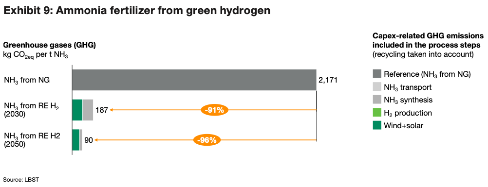 With green hydrogen as an input to ammonia used in fertilizer production, we could deliver a 96% reduction in emissions (90 kgCO2eq/tonNH3 in 2050, compared to 2,171 kgCO2eq/tonNH3 today).