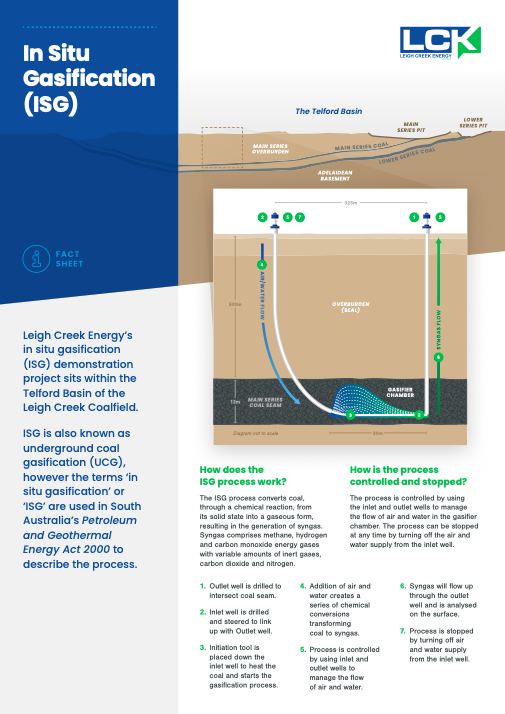 Underneath a disused coalfield in the middle of South Australia, 500 km north of Adelaide, Leigh Creek Energy proposes to begin “in-situ gasification” of underground coal deposits (ISG, as opposed to “coal seam gasification” or CSG), producing syngas at the surface that can be upgraded to ammonia and turned into urea fertilizer. The project has been in development for some years, with permitting underway for a demonstration project leading to a commercial project.