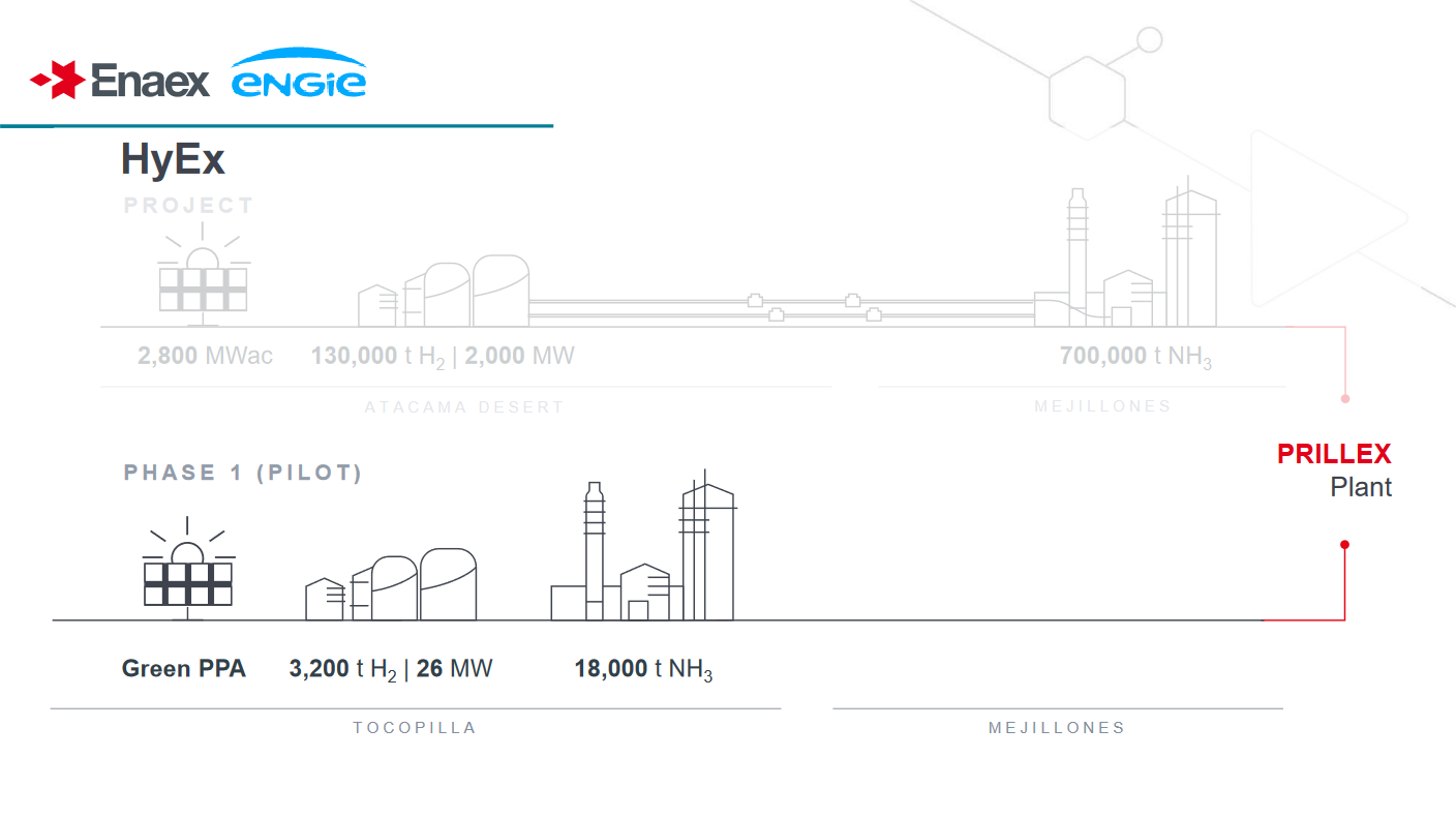At full-scale, the HyEx is estimated to be based on 2.6 GW of newbuild solar PV capacity to power 2.0 GW of electrolyzer capacity in the Atacama desert. The ammonia plant is located downstream in Mejillones, producing 700,000-plus tonnes of ammonia per year. The hydrogen plant and ammonia plant will be connected via pipeline, which also serves as a buffer for intermittency in hydrogen supply. This allows the ammonia plant to operate based on a stable hydrogen supply. Pending FID, construction is expected to start in 2027 for production to start in 2030.