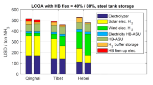Certain zones in northern and western China have been noted for the quality of their wind and solar resources. According to Armijo, he and Philibert started their Chinese study by choosing a handful of locations where either the solar or wind resource is “excellent,” and the other is at least “good.” The analysis consisted of three phases: calculation of the levelized cost of electricity (LCOE) — which takes into account both capital and operating costs — generated from renewable resources; the levelized cost of hydrogen (LCOH) produced by routing the electricity through electrolyzers; and the levelized cost of ammonia (LCOA) produced by using the hydrogen as a feedstock for a Haber-Bosch synthesis loop. To a large degree, the key challenge in the work was to determine for a given electrolyzer size the optimal scale of the wind, solar, and Haber-Bosch plants based on the absolute value and variability across time of outputs from wind and solar plants.