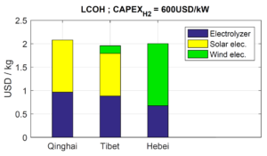 The IEA team developed an algorithm that calculates LCOH as the amount of respective solar and wind power capacities change relative to the capacity of the electrolyzer. This allows identification of the values at which each element in the system is optimized relative to the others. For the Tibet model, the result was an electrolyzer plant with 41% capacity utilization and total curtailment of solar and wind generation of only 2%. Hydrogen produced under this scenario had a levelized cost of USD$1.96 per kg. (A kg of hydrogen has approximately the same energy content as a gallon – 3.8 liters – of petrol.)