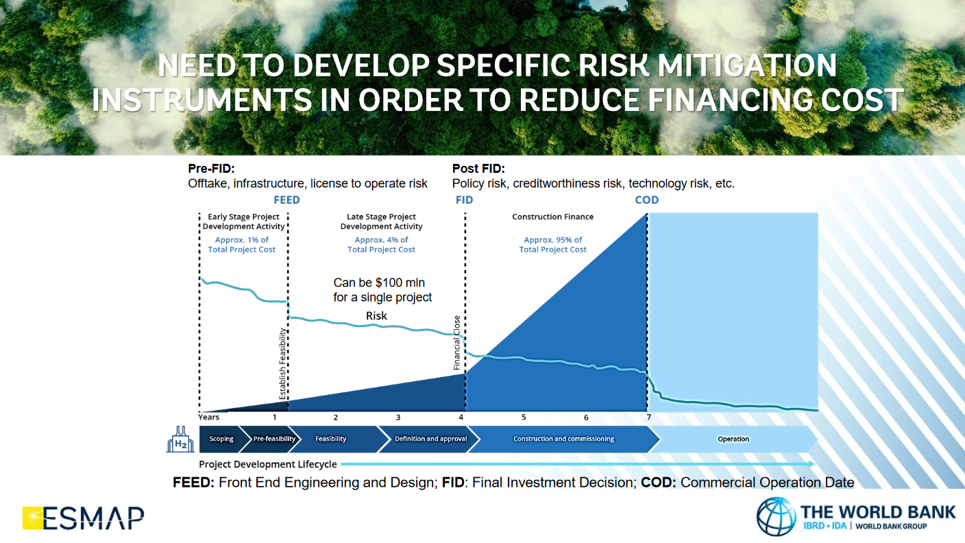Click to enlarge. Levels of risk associated with each stage of project development. Long-term offtake is essential for de-risking projects for investors, encouraging more investment for new projects. From Dolf Gielen, Global Ammonia Certification As Enabler for Accelerated Investment and Financing (Nov 2023).