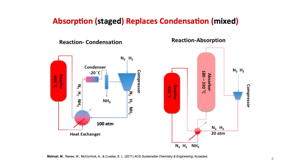 Like Starfire, the University of Minnesota avoids the condensation step, which Haber-Bosch uses to separate product ammonia from the process flow. Unlike Starfire, however, they use absorption not adsorption (for non-chemists this might be an obscure distinction).