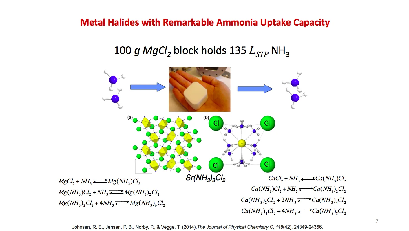 The University of Minnesota team is using metal halides, which have a “remarkable ammonia uptake capacity.” For example, they state that just 100g of metal halide can hold 135 litres of ammonia (“100 g MgCl2 block holds 135 LSTP NH3“).