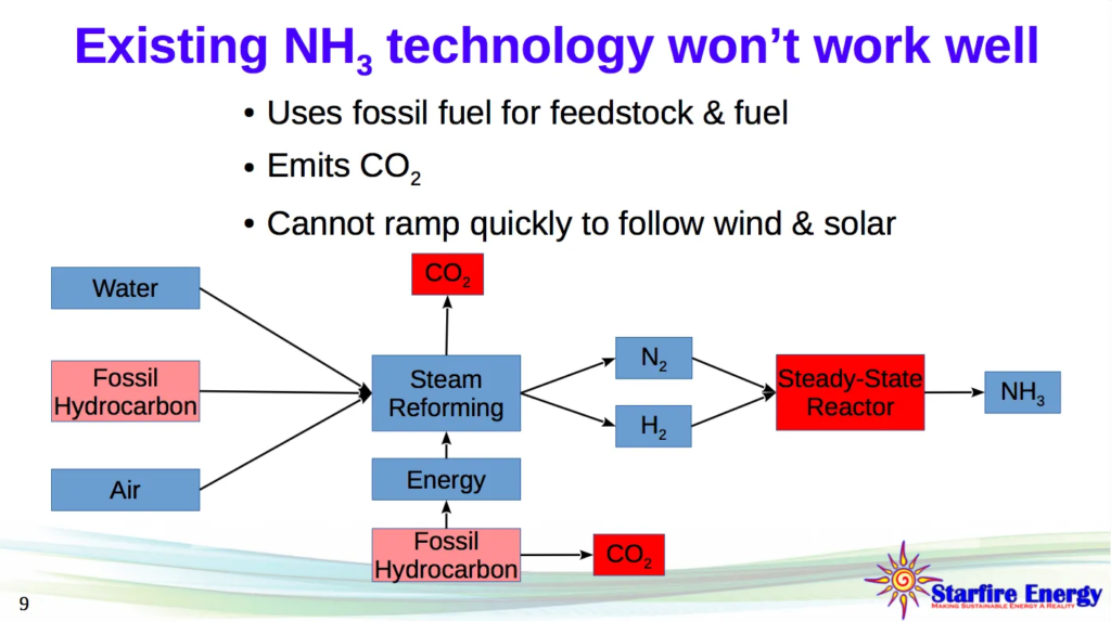 As Starfire’s co-founder, Joe Beach, described it in his presentation at the NH3 Energy+ Topical Conference, the traditional Haber-Bosch process faces two severe disadvantages in the 21st Century energy transition. First, it relies on fossil inputs (natural gas, coal, etc) for both fuel and feedstock, causing significant CO2 emissions (over 1% of global GHGs). Second, it relies on a steady-state reactor, which means that even if the fuel and feedstock were electrified, the ammonia synthesis loop itself cannot “ramp” (turn on and off) quickly: this might not matter for a large-scale, constant power source, like hydroelectricity, but it does not make for an easy match with smaller-scale, intermittent renewable sources, like wind, solar, or tidal power.