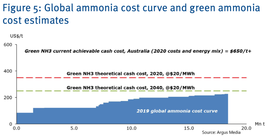 Argus estimates that the production cost of green ammonia today would be more than $650 per ton (using Australia as an example and “assuming 2020 costs, technology, energy mix and an average electricity cost of $50/ MWh”). This is roughly twice the market price of conventional ammonia.
